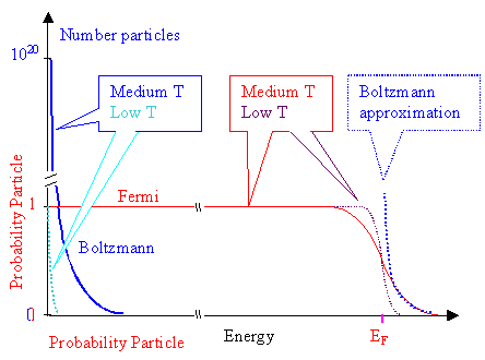 and so far only one particle is allowed per energy level. At T = 0 K the curve would be a rectangular box. The particles of the system occupy as many energy levels as are needed to accommodate them all. Occupation ends only around some special energy called Fermi energy EF, where at T = 0 K the last particle finds its place. Places above the Fermi energy then are empty. At finite temperatures, the Fermi distribution "softens" around the Fermi energy as shown. A few particles have higher energies then the Fermi energy, and some places at lower energies are unoccupied. That produces some disorder or entropy, needed for nirvana or thermal equilibrium since the second law still applies. | |||||||||||||||||||||||||||||||||||||||||||