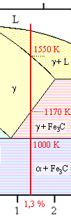 | ??? If this looks Greek to you, that's because it is. Alright. I admit that even a decent general education in most countries does not include ancient Greek anymore. Even one of my daughters, who did time in a classical German "Gymnasium" and certainly learned ancient Greek (together with a lot of Latin and a bit of (ancient, of course) Hebrew), didn't know what "eutectic" meant. So you are definitely excused for not knowing that either. I will get to it soon. But first we look once more at what happens at the 1,3 % carbon concentration I marked with a red line in the phase diagram above. | ||||