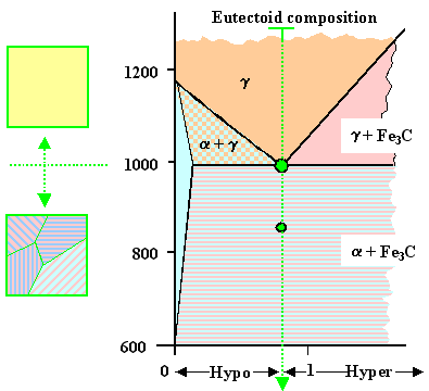 + Fe3C region. This is indicated by the green line. This is exactly the same thing that we found for the case of an eutectic composition not so long ago - except that the phase change here is not from liquid to solid but from solid to solid. That's why we call it eutectoid instead of eutectic, just as you might call (insert politician or banker of your choice) humanoid (= similar to humans) instead of human. While we are at it, here are two more "oids": |
