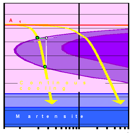 | As before, we have an austenite region, stable above the transformation temperature A1 at 723 oC. Instead of only a ferrite, we now have ferrite and cementite (Fe3C) inside the "nose". In addition, we have the martensite region at low temperatures. | ||||||||