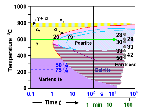 | Does that mean that we cannot use isothermal TTT diagrams to predict what will happen during continuous cooling? Yes, that is exactly what that means. We need to use Continuous Cooling transformation or CCT diagrams! | ||||||||