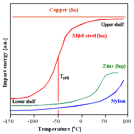| If a ductile-to-brittle transition occurs in your material, you have a serious problem. If your material is under some mechanical load, it might simply break, often suddenly and without any warning. Major disasters we know about were caused by this. Most certainly there were also a lot of minor disaster we don't know about, for example when some warrior's sword suddenly broke because it became too cold for its TDBT. | ||||||||