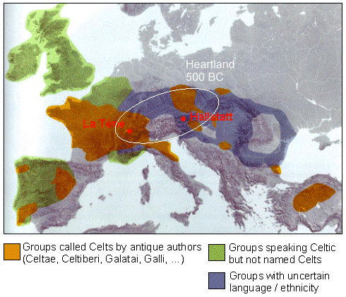 and later, while Southern Scotland, as far as we know, had never been inhabited by Celtic speaking people. The Celts were commonly associated with the so-called La Tène culture, thriving from about 500 BC (beginning of younger European iron age) to 100 BC in what is now Western Switzerland / Eastern France / South Germany. In a more modern view, however, their roots go back to the older Hallstatt culture (800 BC - 600 BC or Early European Iron Age). | ||||||||||||||