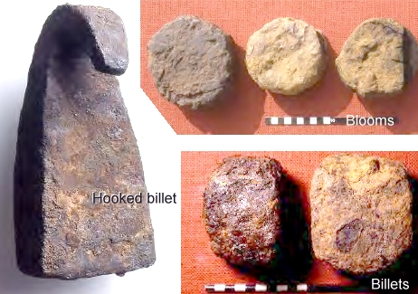 | Just the opposite is true for billets or whole small blooms just "wrought" a little bit, and any number of shapes (including weird ones like the "four-fingered blæsterjern" or clod). | ||||||||||||||
