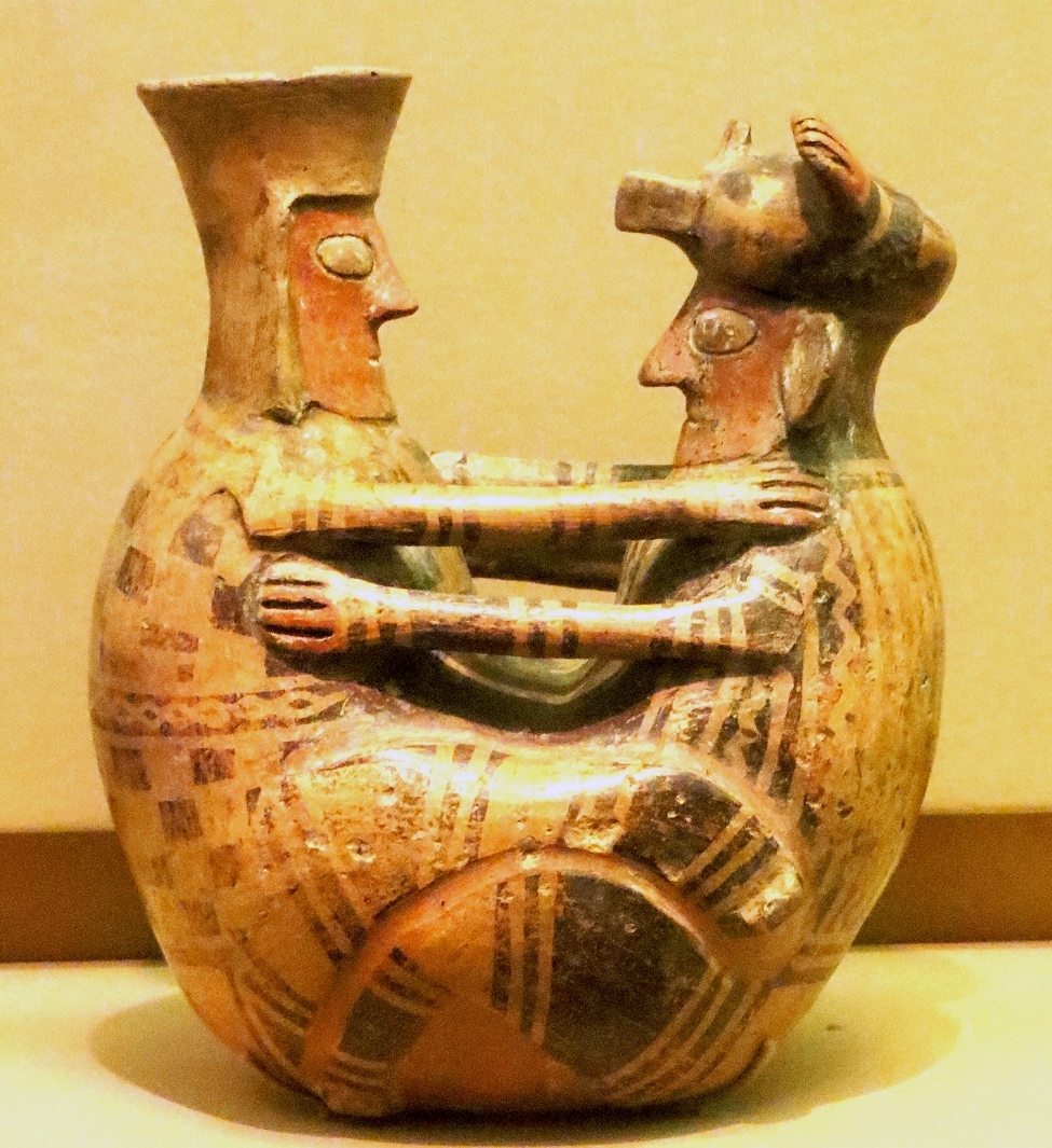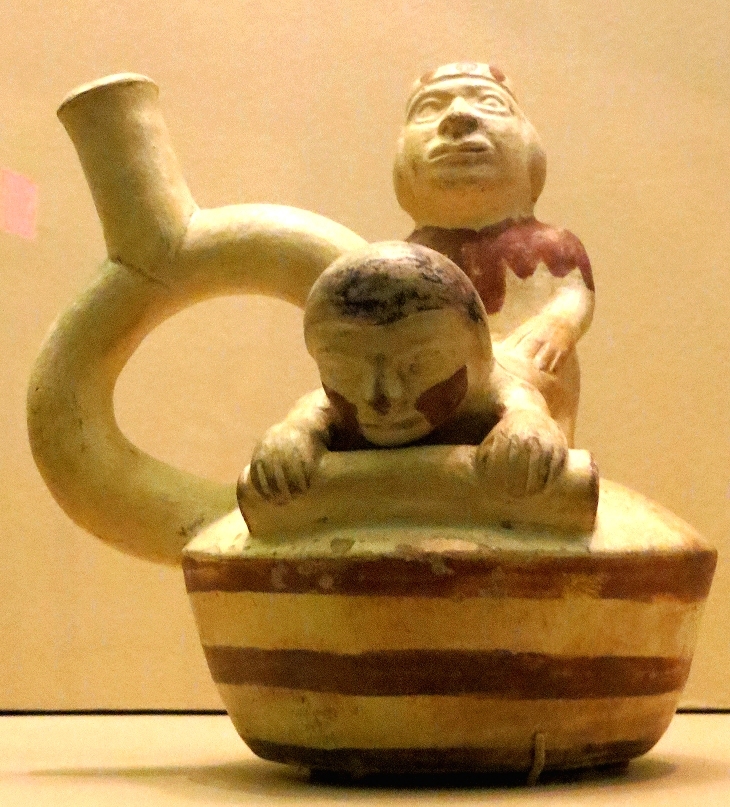 South American Pottery (Moche culture, Peru, from 100 AD to 800 AD) or Recuay style (below) from the National History Museum, New York City. It is a bit amazing (and encouraging) that this kind of pottery (plus a clear description of what is going in) can be seen in a Museum in prudish and hypocritical America. Probably this is only possible in NYC. |