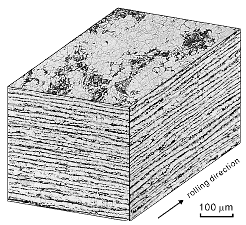 in the rolling direction, if they like it or not. However, this is not necessary in directions perpendicular to the rolling direction. All parts must move inwards to some extent, the material gets thinner after all. "Harder" parts, like cementite particles or pearlite grains might do that differently from soft parts like ferrite grains. The result could be banding. Not very clear and not very convincing. And, of course, a far cry from being a detailed explanation. But we have encountered the basic effect - different deformation in different parts of a specimen - before, when we considered necking. That was complex enough but what I'm considering here is far more complex. So I won't go on. Time will tell. | ||