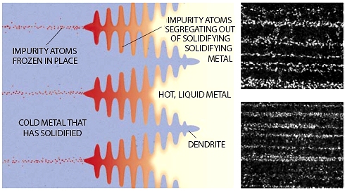 | Here is the picture Verhoeven published in the Scientific American in 2001. It does insinuate that the banding of cementite in real wootz blades as shown on the right comes right from bands of "impurity atoms frozen in place" during solidification between the dendrites that extend extend into the liquid from left to right. | ||||||||