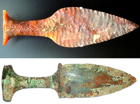 | The shape of fish tail daggers is not exactly the same as the shape of contemporary local daggers but coming close. There are actually many stone tools that were modelled after bronze objects. A more spectacular one is here. | ||||||||||||