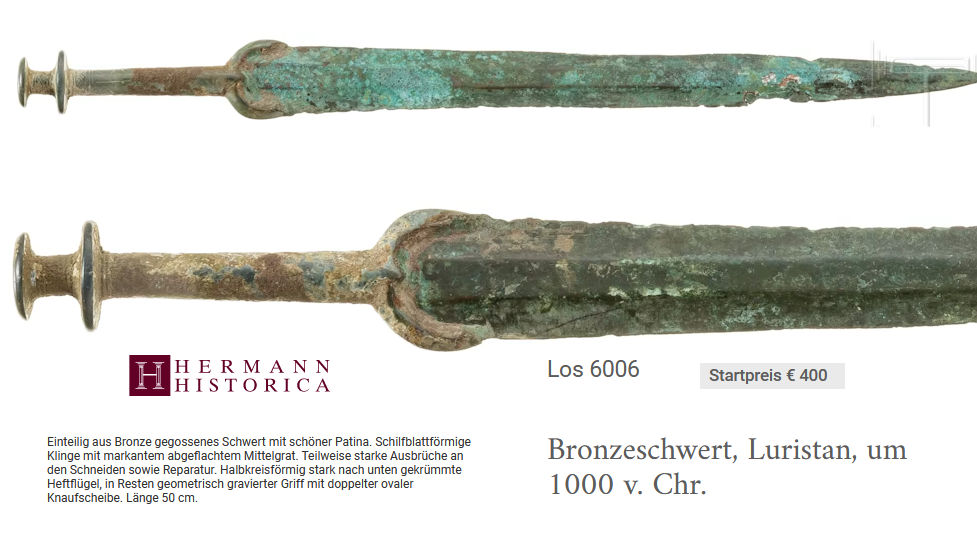 | The double-disc hilt dagger shown above is 43 cm long and could be bought in an auction. It was described as "Scheibenknaufdolch, Eisen, Luristan, 9. - 8. Jhdt. v. Chr". While the date might be correct, its origin may not have been in Luristan but in northern Iran. | ||||||||||||||
