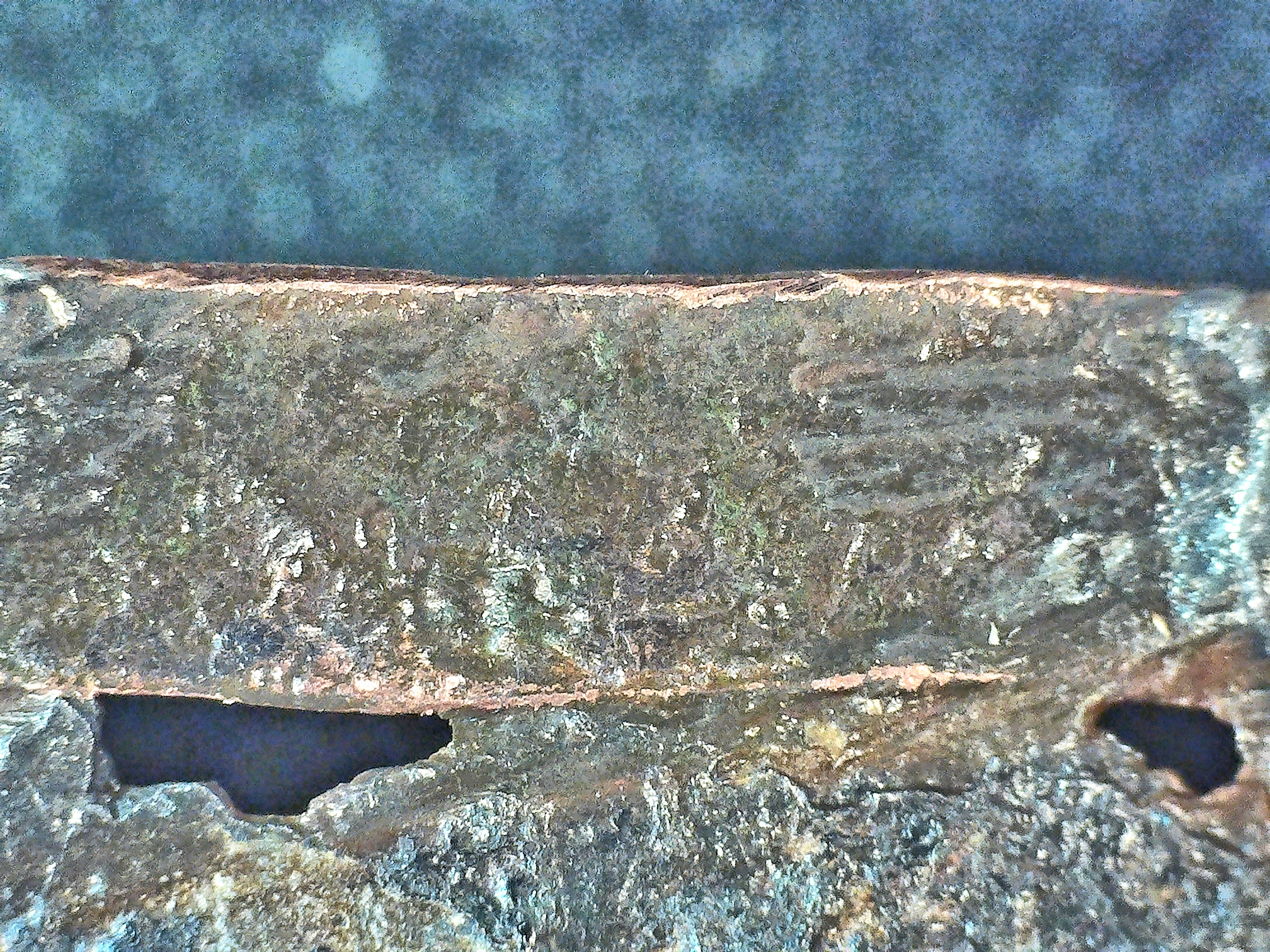 That's what it looks like: Heavily corroded and not very remarkable on a first glance. On a second glance, however, you note that the blade is triangular, not a common feature of Luristan type 1 swords.After some cleaning and looking more closely, you realize that two serious damages to the edge of the blade have been repaired by soldering (with pure tin?) a small piece of bronze into the gap. Here are pictures The silvery metal around the bronze pieces (identified by its typical color) is very soft (easily pierced with a needle) and thus must be tin It's a fake, of course. That's what every serious archaeologist would conclude. I'm not so sure, however. Here are my reasons: 1. The sword itself is definitely genuine and not a fake. The only fake then can be the repair, possibly done by a modern craftsman trying to make the old sword look better. 2. When I received the sword, it was covered with grime and rust;: see the topmost picture. The repairs were not visible and neither were the two big holes in the blade, see below and the small holes next to one bronze insert (whit arrows). All holes and the bronze inlays only became obvious after cleaning 3. While it is possible that the forger artificially corroded and dirtied the sword after making the repair, it makes no sense whatsoever. Why didn't he fill up the holes too? And why making the appearance much worse by corrosion if his goal was to make the sword look better? 4. Now to the killer argument: If the two holes behind the bronze inlay were there originally, the then incomplete repair makes no sense at all. If they were produced by artificial corrosion after the repair, the whole process makes no sense at all once more | ||||