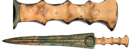 | An example of a (bronze) dagger with a side bar hilt filled with some bone. No rivets were used. I guess some kind of glue was employed. |