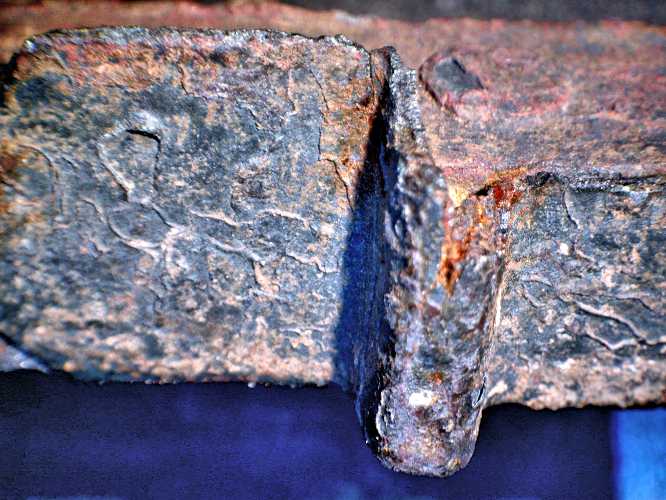 The protrusion is on the right. It is clearly restricted to the tang and does not extend across the side bars which are are clearly visible. The blueish structure to the left of the protrusion is a remnant of the sheet metal used to make the Randleiste / side bar. It can be clearly seen that it consisted of several very thin layers, hinting strongly at faggoted material. |