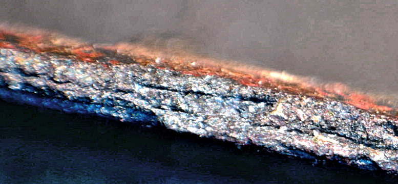 Luristan mask sword blades. Elegantly curved with a well -defined midrib. The corrosion pattern is remarkable. Layers of constant thickness are peeling off, starting as bubbles that grow and eventually burst. That indicates that corrosion proceeds through a small opening below a layer in a weak interface. It then spreads sideways, mos likely along imperfect welding interfaces. Gas is related and lifts the iron on top to form a bubble. |