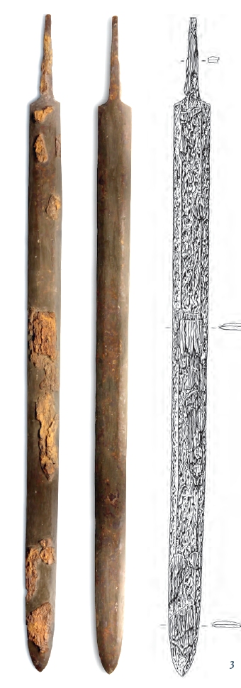 see it in all its glory, not so great for publishing with regular 2-dim. pictures. Here is one (more or less random) example: the sword in grave No. 2 in Warburg-Ossendorf; from around 570 AD. See p. 407 and p. 507 of the thesis. It is rather well preserved but you can't see any pattern welding on the surface. Here is a picture of the sword together with a drawing: | ||||||
