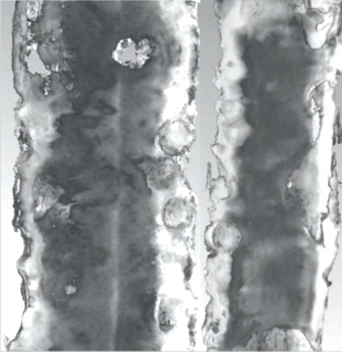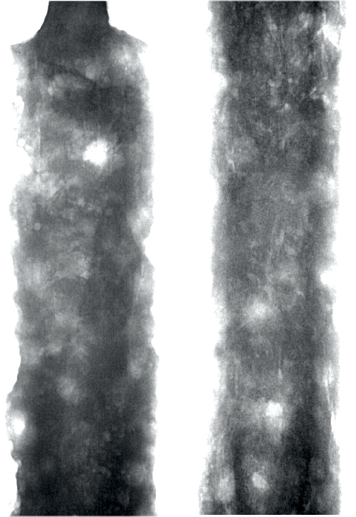 | Next some straight x-ray pictures of parts of the blade. There isn't much to see, the structure more or less reflects thickness variations. In particular, it is not obvious that the sword was pattern welded | ||||||