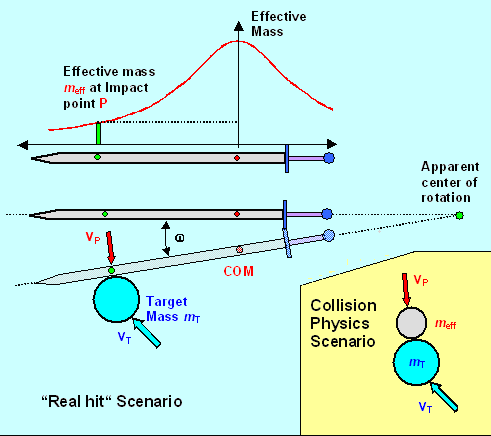 not allowed to use equations. It is sufficient to look at simple collisions of two bodies as shown in the right hand corner above to get useful results. We assume "in-between" collisions, not 100 % inelastic but at least with a high percentage of inelasticity. Here is what we will find for the energy transfer efficiency. First, it is a product of two components. The first one describes the degree of inelasticity of the collision, the second one the relation between the (effective) masses of sword and target. What do we know about these quantities? |