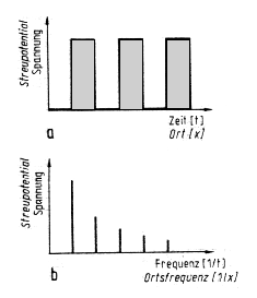Zur Veranschaulichung betrachten wir eine einfache Analogie: Ein Rechtecksignal in der Elektroakustik einerseits und einen rechteckigen Potentialverlauf, der unser Objekt darstellt, andererseits (Bild 3). Das Spektrum des Rechtecksignals ist bekannt; es besteht aus einer Grundfrequenz und einer Reihe von Harmonischen. Genau dasselbe Spektrum hat das Rechteck-Potential in einem Amplituden/Ortsfrequenz-Diagramm. Ähnlich wie das akustische Spektrum angibt, welche Frequenz mit welcher Stärke im Signal vorkommt, gibt das Ortsfrequenzspektrum an, welche Ortsfrequenzen (oder anschaulicher: welche Abstände zwischen Objektpunkten) mit welcher Häufigkeit auftreten. Hohe Ortsfrequenzen entsprechen dabei kleinen Abständen. Jedes Objekt kann durch ein eigenes Ortsfrequenzspektrum beschrieben werden.