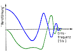 Der entscheidende Punkt ist der Frequenzgang des Vorverstärkers bezüglich der im Signal enthaltenen Ortsfrequenzen. Ein guter Verstärker sollte einen geraden Frequenzgang haben, also alle Phasenverschiebungen unverfälscht übertragen. Das kann die Objektivlinse nun leider nicht. Auf Grund der Linsenfehler entstehen sogar noch zusätzliche Phasenverschiebungen, die außerdem noch sehr stark von der Abstimmung (d.h. von der Fokussierung) abhängen. So ist der Frequenzgang außerordentlich nichtlinear: Bild 4 zeigt ein Beispiel. Dieser Frequenzgang (oder wie es in der Physik heißt: die Kontrast-Transfer-Funktion) ist von überragender Bedeutung in der Hochauflösungsoptik.
