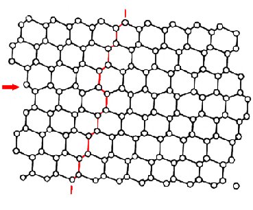 | Bild 5. a) Modellbild eines Si-Kristallgitters. Ein sogenannter Stapelfehler ist in der Bildmitte erkennbar | b) Elektronenmikroskopisches Bild eines Si-Kristalls mit Stapelfehler. Jeder weiße Punkt entspricht in erster Näherung einem Atompaar des Modellkristalls | c) Bild desselben Stapelfehler aber bei anderer Präparatdicke. Bedingt durch eine Dickenänderung des Kristalls erscheint das Bild sowohl verrauscht als auch "falsch" zu sein. |