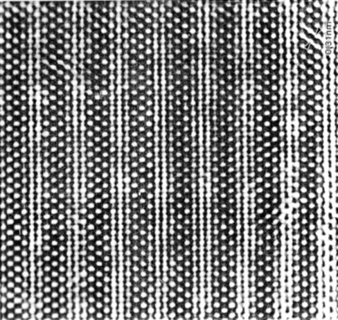 The image shows one of the first HRTEM images taken around 1979; it is the <110>