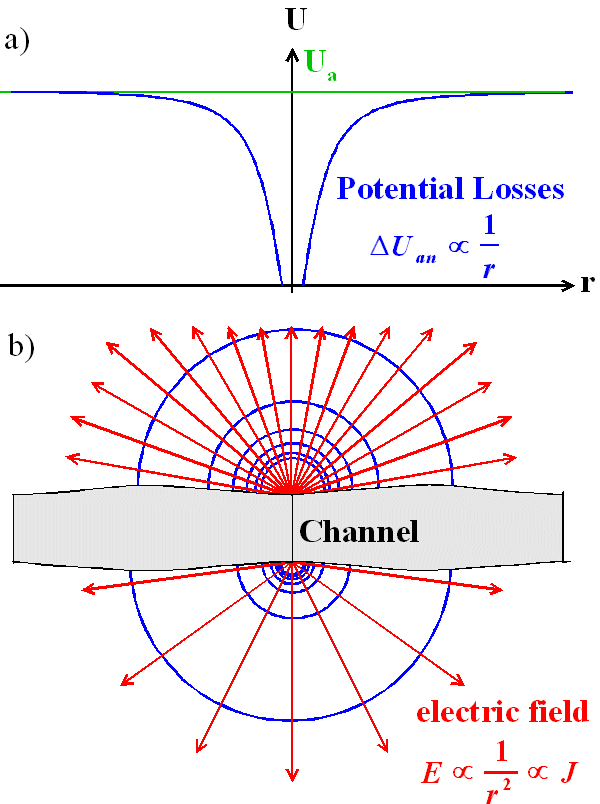 In a simple approach this may be included into the model just by a radial symmetric (with respect to the center of the burrent burst chanel) potential drop and a corresponding change in the elctric field strength as displayt in the following figure