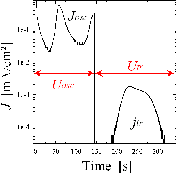Switching at an arbitrary moment from an anodic potential at which silicon oxide was formed to open circuit potential (i.e. a potential at which no current is flowing after waiting a very long time), one will measure a so called transient current. This current occurs as soon as a local oxide has been dissolved due to nonstoiciometrical suboxide at the interface betwee silicon and silicon oxide.