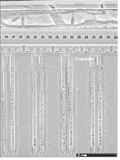 | Elektronenmikroskopisches Querschnittsbild durch einen 64 Mbit Speicher von Siemens. Die Skala hat eine Länge von 2 µm. Nur im Transmissionselektronenmikroskop ist überhaupt noch etwas zu erkennen. Viel ist für den Laien nicht zu sehen; die Herstellung dieser Struktur benötigt aber mehr als 500 hochkomplizierte Arbeitsschritte. Eine Schemazeichnung eines der 64.000.000 Speicherelemente ist im Link gezeigt. | ||