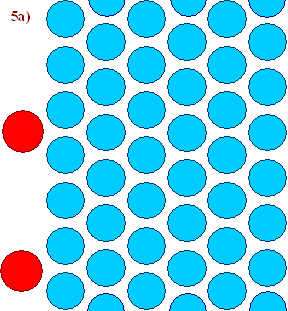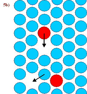 sitzen auf der Oberfläche des Si - Kristalls b) Die Phosphoratome sind mit Hilfe von Leerstellen in das Si - Kristallgitter eindiffundiert; ein P - Atom (und ein Si - Atom) sind gerade im Begriff zu springen. c) Der Zustand kurz danach. Die Leerstellen sind wegdiffundiert und laufen statistisch durch das Gitter; die Phosphoratome müssen für weitere Diffusionsprünge warten, bis wieder zufällig eine Leeerstelle vorbeikommt. |