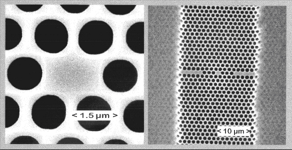 | Photonischer Kristall, hier als schmales Band strukturiert. Die beiden vom Rand in das Innere führenden porenfreien Bereiche sind Lichtwellenleiter der kleinstmöglichen Di-mension und können Licht in die zentrale fehlende Pore einkoppeln. In diesem Zentralbereich - im linken Bild vergrößert gezeigt - sind die Lichtteilchen "gefangen", d. h. für einige Zeit eingesperrt. | ||||