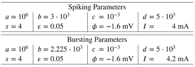 Simulation parameters used to create spiking and bursting behavior. Note that variable names refer to the parameters of the set of ordinary differential equations of the original Hindmarsh-Rose model 1. Normalization constants are chosen to L0 = 1nH, R0 = 1Ω, and U0 = 1V. Additional parameters for the memristive Hindmarsh-Rose model are set to α = 10-9 .