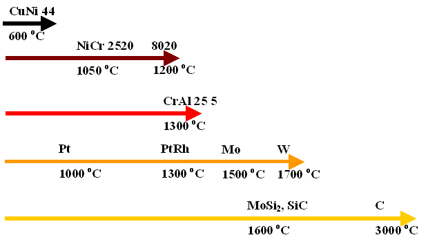 | The figure shows some materials for heating elements and the maximal temperature they can endure. | |||