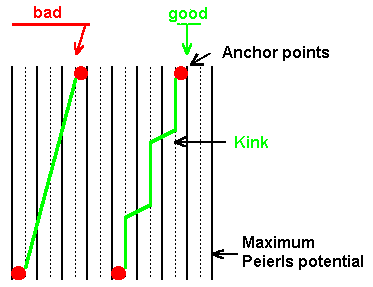 The dislocation runs in the minima of the Peierls potential as long as possible and then crosses over briskly