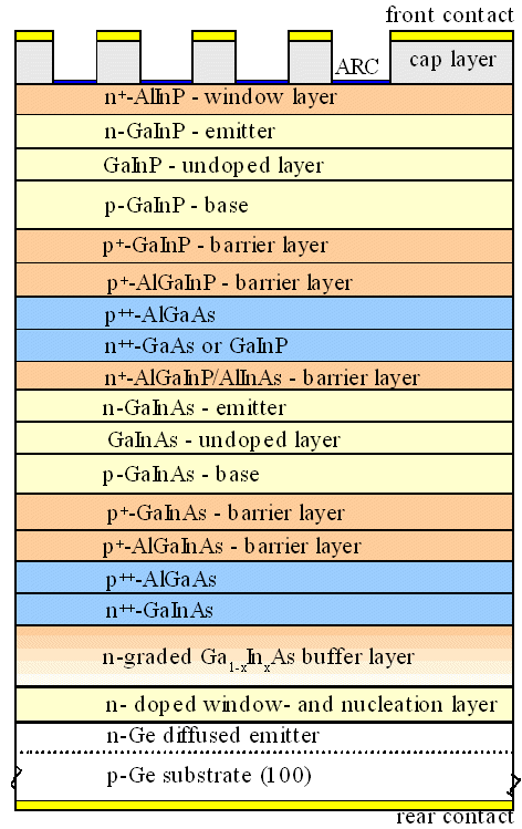 work because misfit dislocations cannot be avoided! While the picture above might insinuate that there are plenty of possibilities left, it is not so. The semiconductors above have been every carefully chosen to do what is wanted of them as well as possible, while not generating misfit dislocations in the the various interphases. There is a lot of compromising and long hard work in this structure. Making much better and simpler solar cells would be possible (and much easier) if we wouldn't have the misfit dislocation problem. Same thing for Lasers and so on, and for all those gadgets that don't even exist because of that problem | ||||||||||
