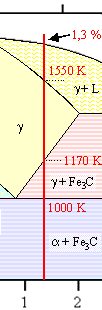 diagram again and stay right with the 1,3 % carbon composition line we used before, you realize that upon cooling from