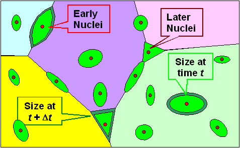 | Shown are three tiny red nuclei: in the grain, on a grain boundary and on a grain boundary junction. Some time t has passed since their formation, and they have grown to some (light green) size with a shape that is determined to some extent by the crystallographic orientation of the grain and the conditions at the grain boundaries. | ||||||||