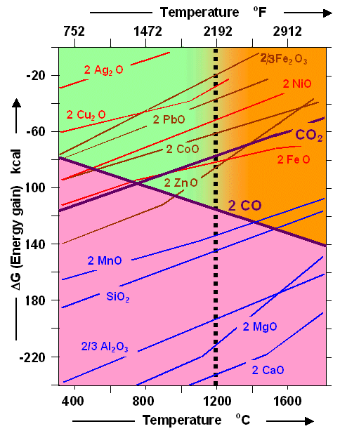 graph. There are more metal oxides that can be reduced by carbon (monoxide), for example nickel (Ni) or tin (Sn) oxide. Their curve would also be in the "right" green and orange area, but they and many others have been omitted for clarity. | ||||||||