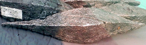| Currency bars look a bit like a half-made swords. Their German name is "Schwertbarren" ("sword bars") and while this name is self-explaining, "currency bars" is not. They were found mainly in England. When Caesar invaded England in 54 BC, he noticed that the early British smelted a bit of tin and iron but imported copper. He also was of the opinion that the British used standardized (more or less) bronze bits and iron staves as a kind of currency instead of coins. Caesar wrote that down in his "De Bello Gallico" and untold numbers of High School students had to suffer through it. In the 19th century Caesar's influence finally lead early archeologists to coin the designation "currency bars" for these peculiar objects. | ||||||||||||||