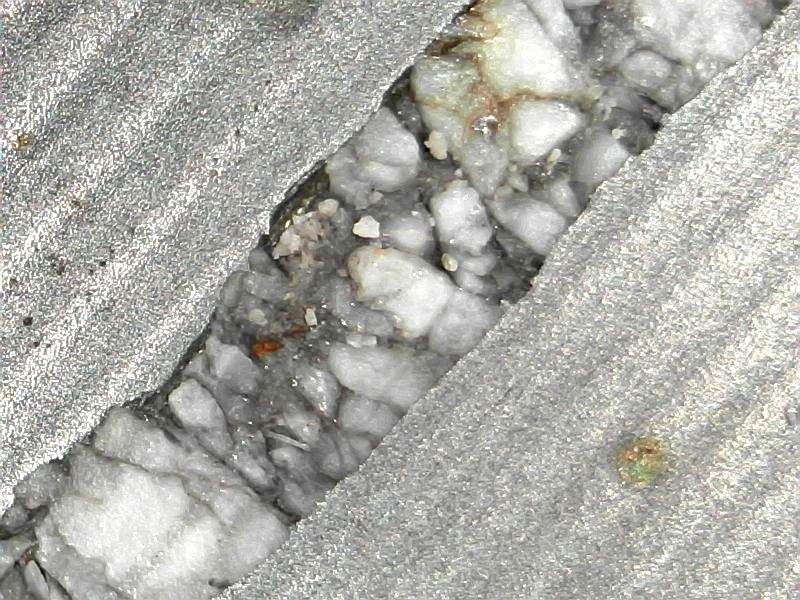 | Here is what you find in the large defect zone of the hilt. Probably fayalite crystals - but this is only a guess. | ||||||