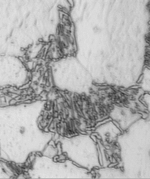 changes in the grain structure but not so much of the grain size. There is no particular evidence of welding like sharp transitions between grain structures. The outer parts (belonging to the rings) are typically containing strongly disturbed structures, probably due to a high carbon content. The middle part (the hilt itself) consists of iron with a smaller carbon content. The huge "slag" inclusions appearing deep black in the pictures actually do contain the "crystals" alluded to before. They become visible if the pictures are processed by strongly increasing the "gamma" value; an example is shown below. The "dark areas" inside some grains are somewhat disturbed pearlite, at least in the case where high-magnifications pictures were taken and allowed that identification; an example is also shown below. |