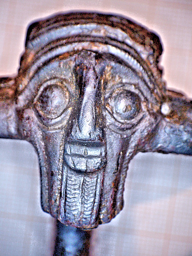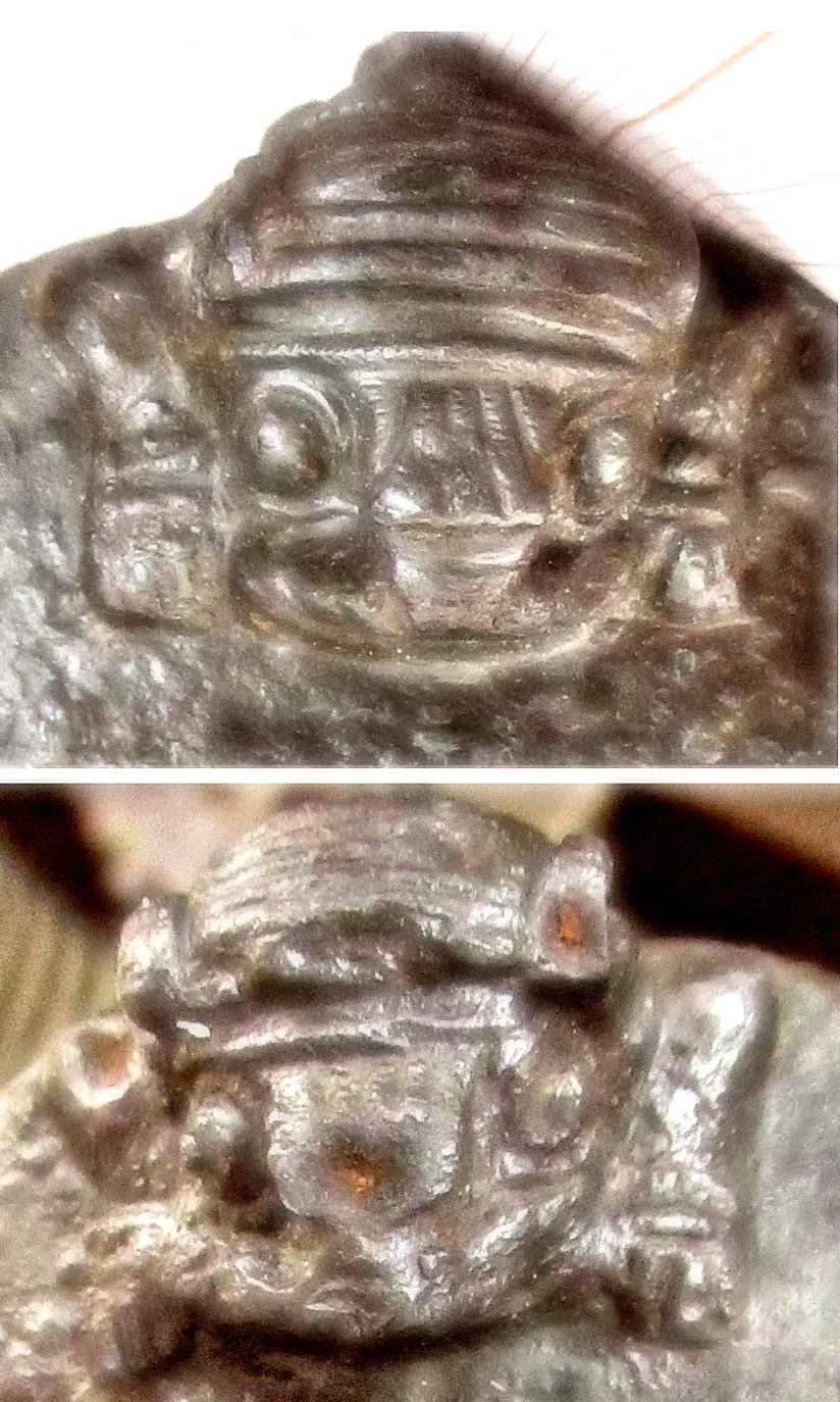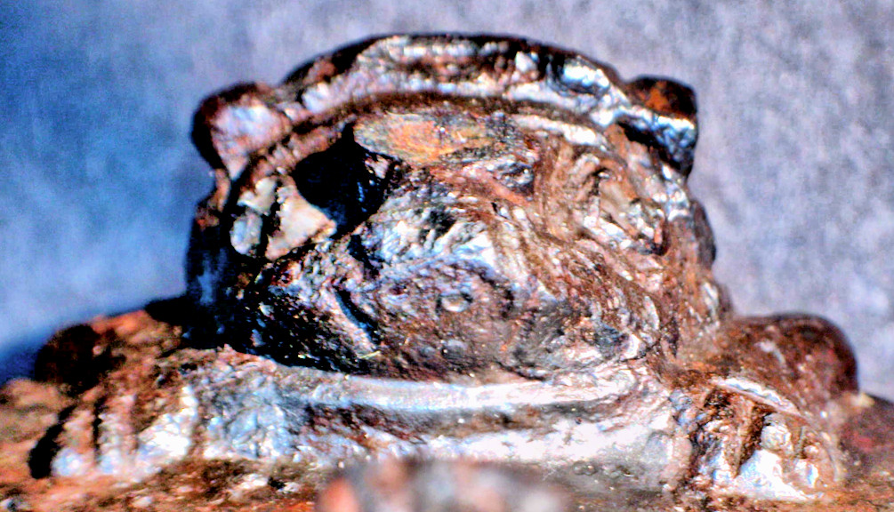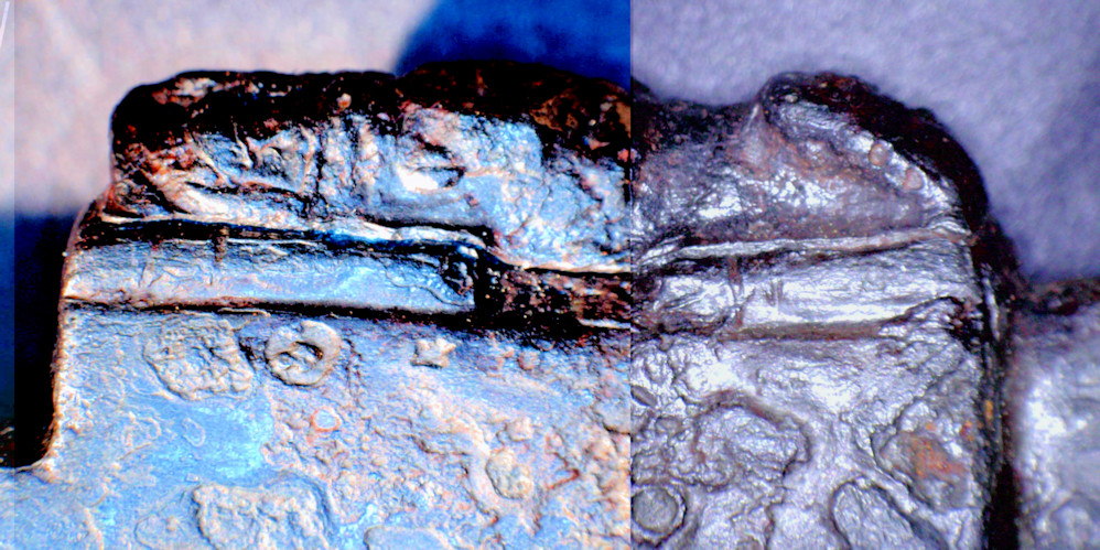 fixed, possibly followed by firing welding the rim. However. Upon close inspection, it appears that the un-corroded parts above are not just crimps but also the legs of the animal. This might indicate that the final carving was done after fixing the raw version of the animal to the heft and then carving the details. This makes some sense since fixing the whole contraption by fire welding including hammering, will damage the sculpture to some extent, especial at the legs on the far outside and right where the crimping takes place. It remains to be seen of this feature can also be found at other IMAS that started to come apart. Well, I had an epiphany about that. Use this link for details and go to the end of the module. | ||||