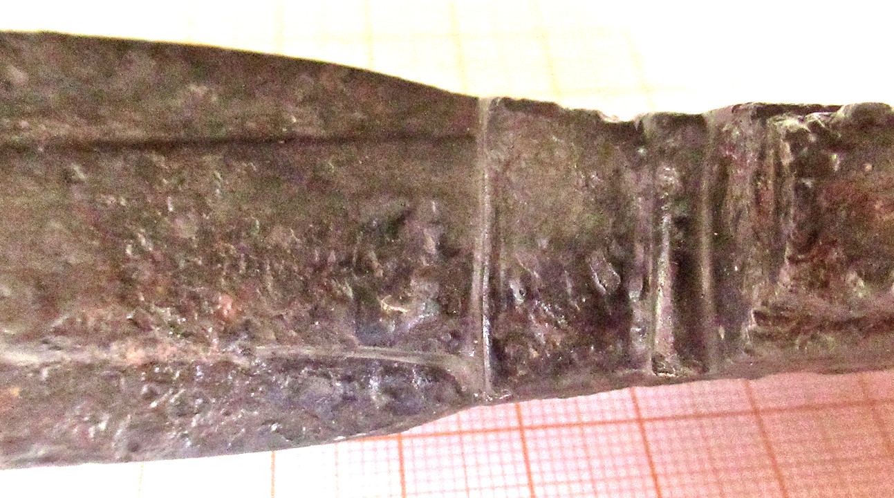 the lower part of the blade What can be seen is compatible with a layered structure. No X-ray picture was taken. n what follows I keep the format of the IMAS 1 file. What one finds upon close inspection is: The Blade The typical IMAS blade with a mid rip. Its length is identical to IMAS 1 but it is a tad wider at the lower half. The blade may have bee somewhat sharper than that of IMAS 1 but it is hard to tell due to corrosion. There are no wormholes. Corrosion Patterns The blade and the animals are more corroded that IMAS 1 but thee are no notable structures. Connection of Blade and Hilt Similar to IMAS 1 but less elaborate. The mid rip width stays constant but the blade shows more taper. There is no scalloped band.