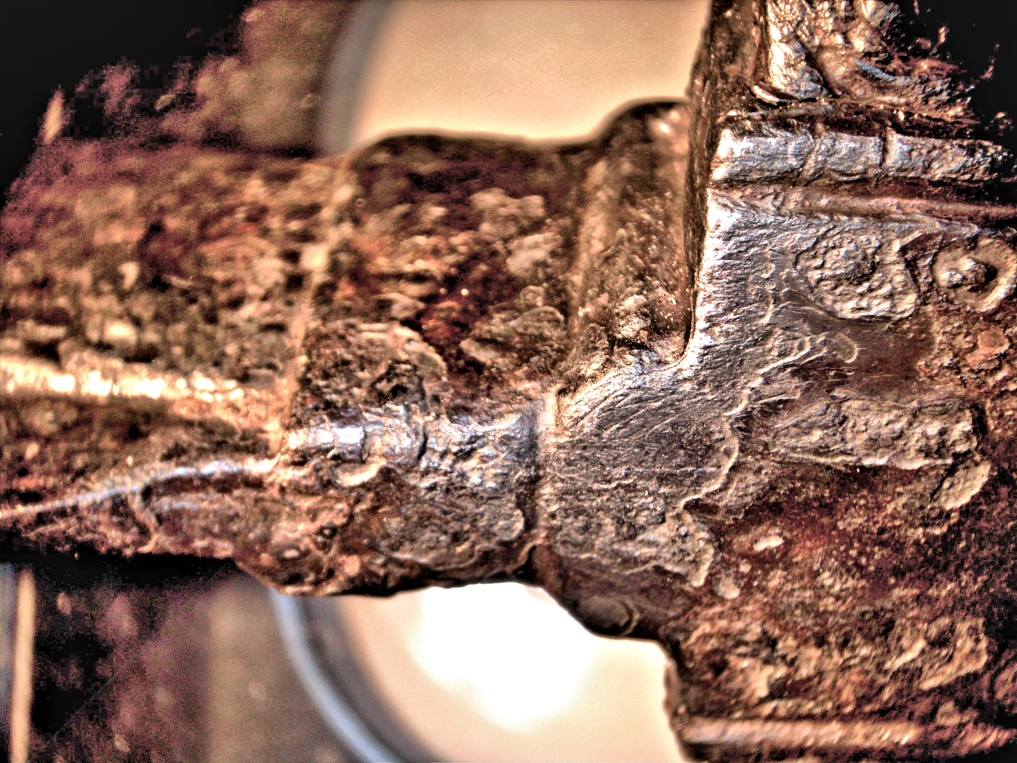 corroded animals. The blade is actually broken but an attempt at repair was made. I hand-polished the cross-secretion of