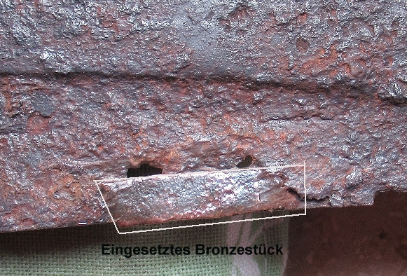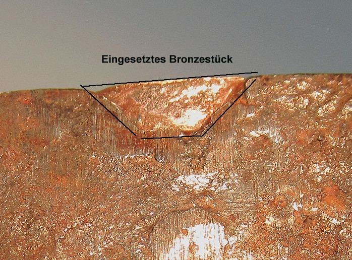 are due to corrosion taking place for almost 3000 years. The questions now is: Would the old Luri smiths have been capable of doing a repair like this? My answer is: yes! They certainly had noticed that tin has a low melting point and that you could melt it just by touching it with a medium hot copper rod. Moreover, the molten tin will wet the copper and coat the surface - provided the copper (or bronze) was clean. The hard part is to get liquid tin to wet iron. That needs a flux of some kind. While not any fatty substance (like bees wax) will work, some might. We just don't know those secrets anymore because we buy some working flux somewhere without having the faintest idea of what it contains.Wikipedia claims that olive oil and Ammonium chloride would work for soldering iron. Ammonium chloride, if you wonder, can be made from urine. If the old Luristanis had ammonium chloride is doubtful but they may have had similar substances and who knows what else might work Why did the use a piece of bronze and not a piece of iron to fill the holes? Who knows, My guess is that it is just much easier to work with. It it was completely covered with tin, it looks like like iron and you hardly could see the repaired part of the blade. | ||||