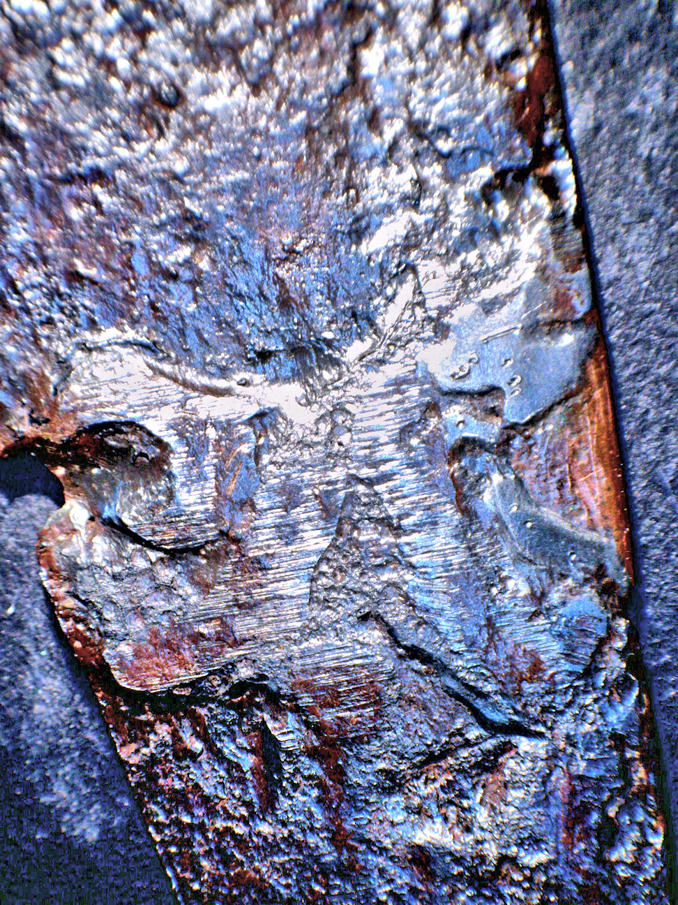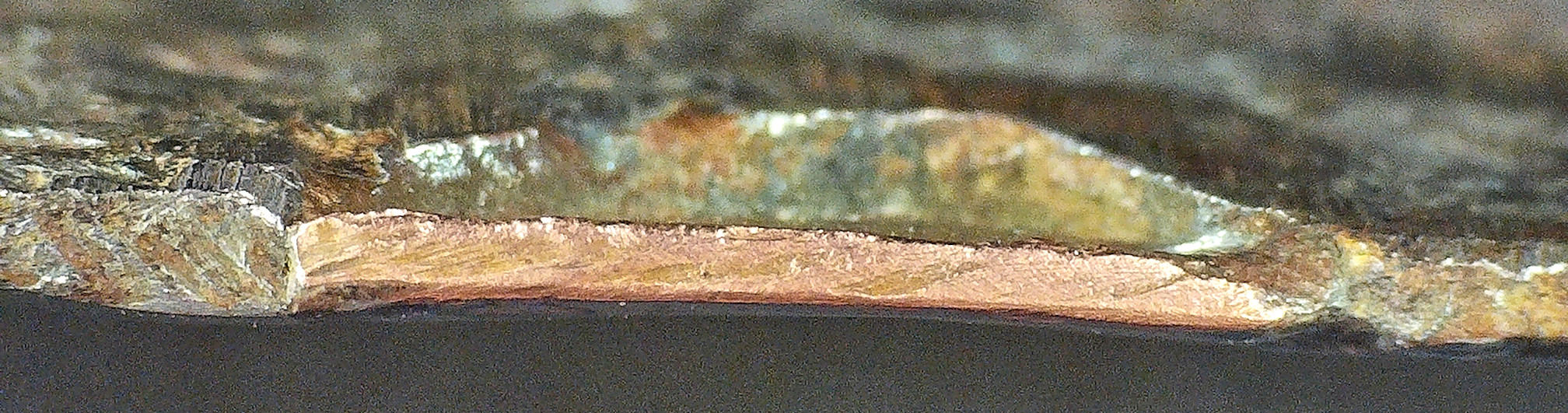 That's what it looks like: Heavily corroded and not very remarkable on a first glance. On a second glance, however, you note that the blade is triangular, not a common feature of Luristan type 1 swords.After some cleaning and looking more closely, you realize that two serious damages to the edge of the blade have been repaired by soldering (with pure tin?) a small piece of bronze into the gap. Here are pictures The silvery metal around the bronze pieces (identified by its typical color) is very soft (easily pierced with a needle) and thus must be tin It's a fake, of course. That's what every serious archaeologist would conclude. I'm not so sure, however. Here are my reasons: 1. The sword itself is definitely genuine and not a fake. The only fake then can be the repair, possibly done by a modern craftsman trying to make the old sword look better. 2. When I received the sword, it was covered with grime and rust;: see the topmost picture. The repairs were not visible and neither were the two big holes in the blade, see below and the small holes next to one bronze insert (whit arrows). All holes and the bronze inlays only became obvious after cleaning 3. While it is possible that the forger artificially corroded and dirtied the sword after making the repair, it makes no sense whatsoever. Why didn't he fill up the holes too? And why making the appearance much worse by corrosion if his goal was to make the sword look better? 4. Now to the killer argument: If the two holes behind the bronze inlay were there originally, the then incomplete repair makes no sense at all. If they were produced by artificial corrosion after the repair, the whole process makes no sense at all once more | ||||