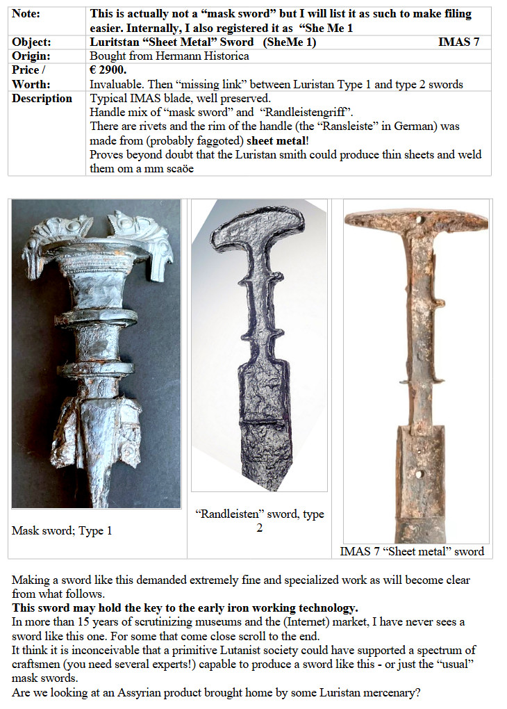 Hefte zur Vorgeschichte, n. 4), Bonn, 1973, p-97 ff The papery deals mostly with proper Luri type 1 mask swords but also shows the two sword shewn on the right. This is a very readable paper. It mentions the elastic band running around the hilt and daters these swords ito th the 8/9th century BC, supposedly younger then the true IMAS ___________________________________________ Then we have, of course, the Bible: Acta Iranica, Vol. XXVI, 2003; and the select articles of Bruno Overlaet listed n the Project files. There are not too many swords like the one here but enough top establish the connection to Luristan. We also have a graphic illustrating the development over time: (Below) |