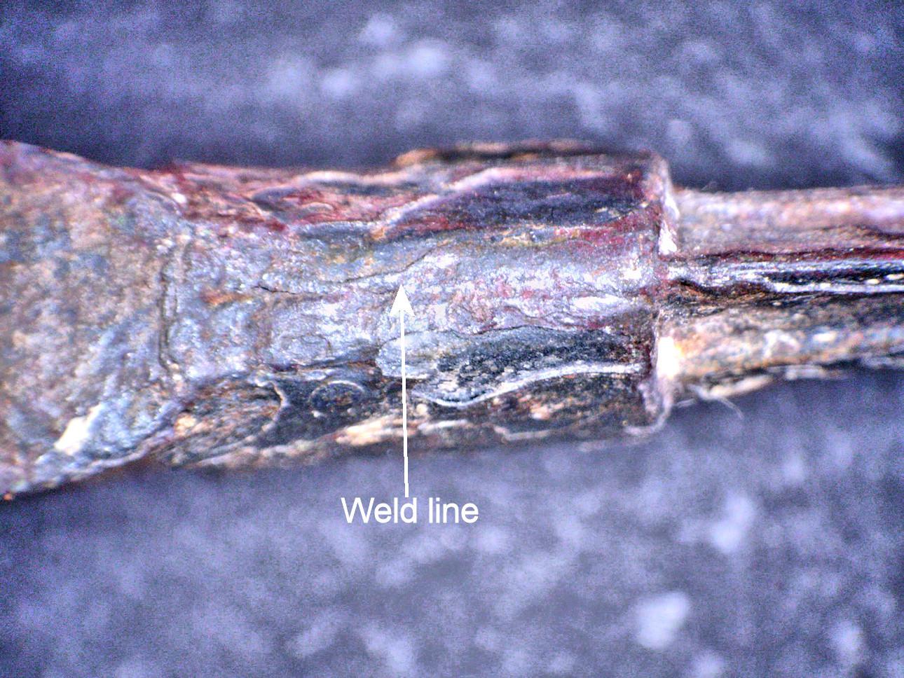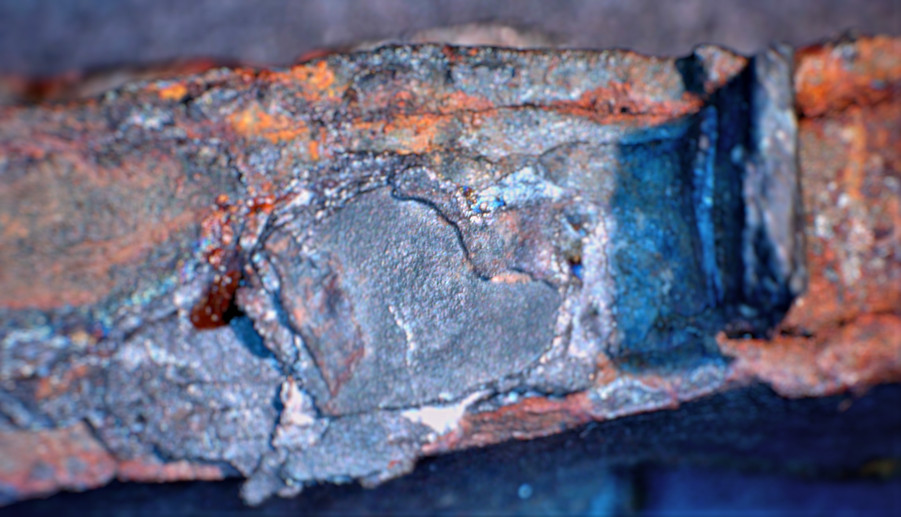 The protrusion is on the right. It is clearly restricted to the tang and does not extend across the side bars which are are clearly visible. The blueish structure to the left of the protrusion is a remnant of the sheet metal used to make the Randleiste / side bar. It can be clearly seen that it consisted of several very thin layers, hinting strongly at faggoted material. |