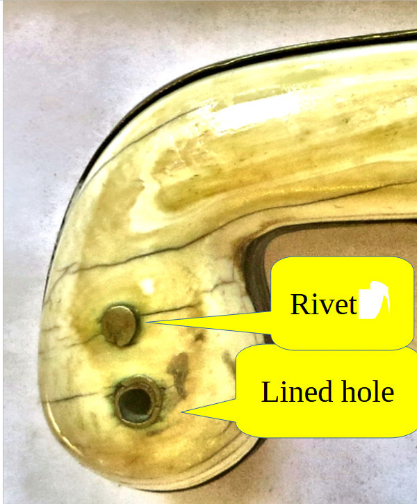| This gives us a first a clear indication that the old smith could work with sheet metal in a delicate way. But why lining a hole that we might assume was intended to hold the inlay in place with a rivet? Typically, holes were lined with a metal cylinder if that cylinder extends through the material of inlay ed as shown in the following picture of the hilt of a 19th century kilic. | ||||||