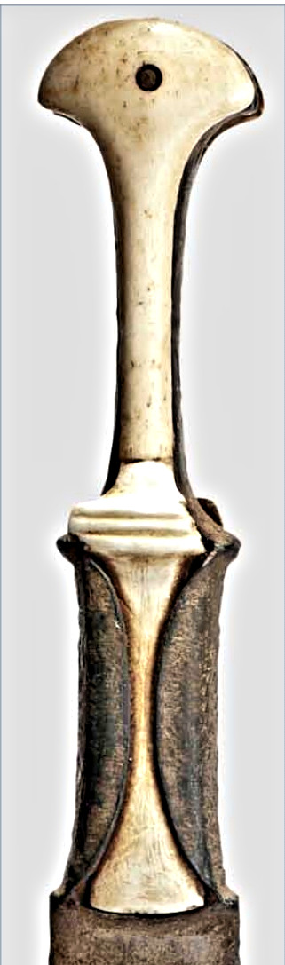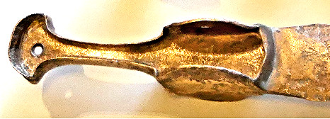 is: One inlay or two – one for the crimping plate, one for the rest? The picture on the right show the one inlay case for an old bronze dagger. It features a real crimping plate next to the blade and a pommel similar to the one in our case. The inlay material is some bone. My guess is that there were two inlays for our sword. Something elaborate on the crimping plate; e.g. a figure like the animals on real IMAS swords. The rest may have been inlaid with some bone or wood. The smith did not make it easy for the inlay guy. The surface onto which the inlay had to be glued or otherwise attaches is rather uneven. The rivet heads are protruding and the re-enforcement strips produce steps on the crimpimg plate and near the pommel. Moreover, fitting the inlay int the protrusions and into the narrow pommel tips, would take very fine carving and fitting of the inlay. Where does this leave us? I will make a few points and then add an epiphany I had months after I had written all of the above: 1. The old smith who forged that sword was a superb craftsman. He worked with very bad iron and had only primitive tools at his disposal but produced a product that modern smith would not easily duplicate. That is also true for the smiths who made the mask swords. 2. Im convinced that faggoting was used in all the IMAS treated here. That is remarkable, considering that in all of the literature to old iron, this technique is never mentioned. 3. The old smith were capable of fire welding (as faggot already proves). But they could do that on very small scales and how they did it is a mystery to me. 4. Luristan shows no traces at all that around 1000 BC a society existed that cold produce high tech items like mask swords. But yet, these swords (and bronze objects like the Master of Animals), have never been found outside Luristan (in contrast the type 2 iron swords). This is a big puzzle. 5. This sword, if properly investigated, may well be the key for the understanding of early iron technology. |