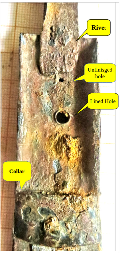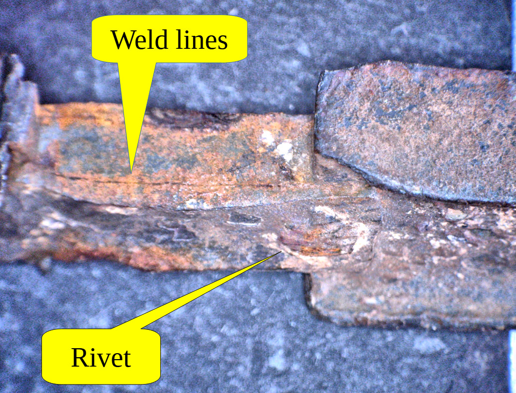 | Re-enforcement Strip The re-enforcement strip is fixed with 4 rivets to the tang. One rivet runs through the crimping plate. If the two re-enforcement strips are also fire welded to the tang is unclear. Considering that we look at the result of a lot of intricate fire welding, it is not clear why the old smith felt that rivets were needed, not quite trusting the welding of crimp plate tot the tang The re-enforcement strips extend to the beginning of the pommel, and their function is unclear. They are relatively thin and thus no big enforcement. |