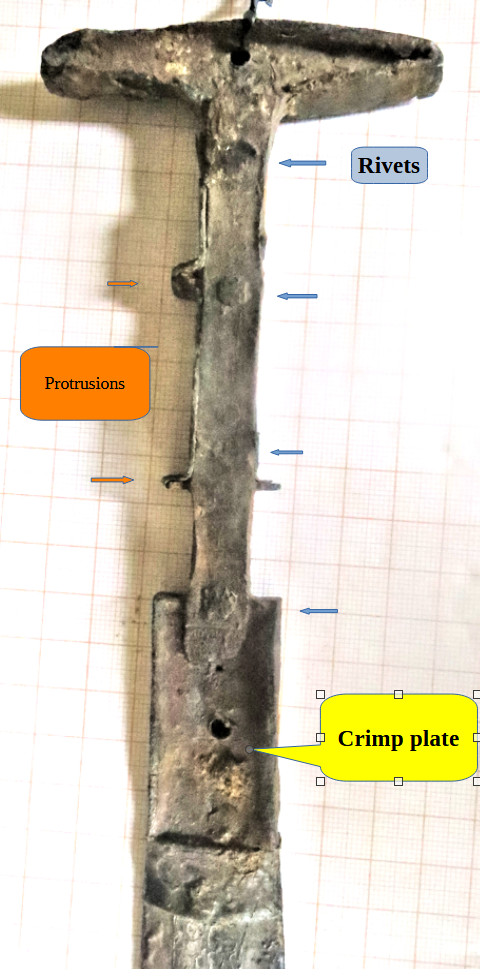 If the body of the crimp plate (plus possibly sidebars) are just part of the he tang of the blade is also unclear There are no signs, however, that plates were welded on to the tang or that we have a layered structure. |